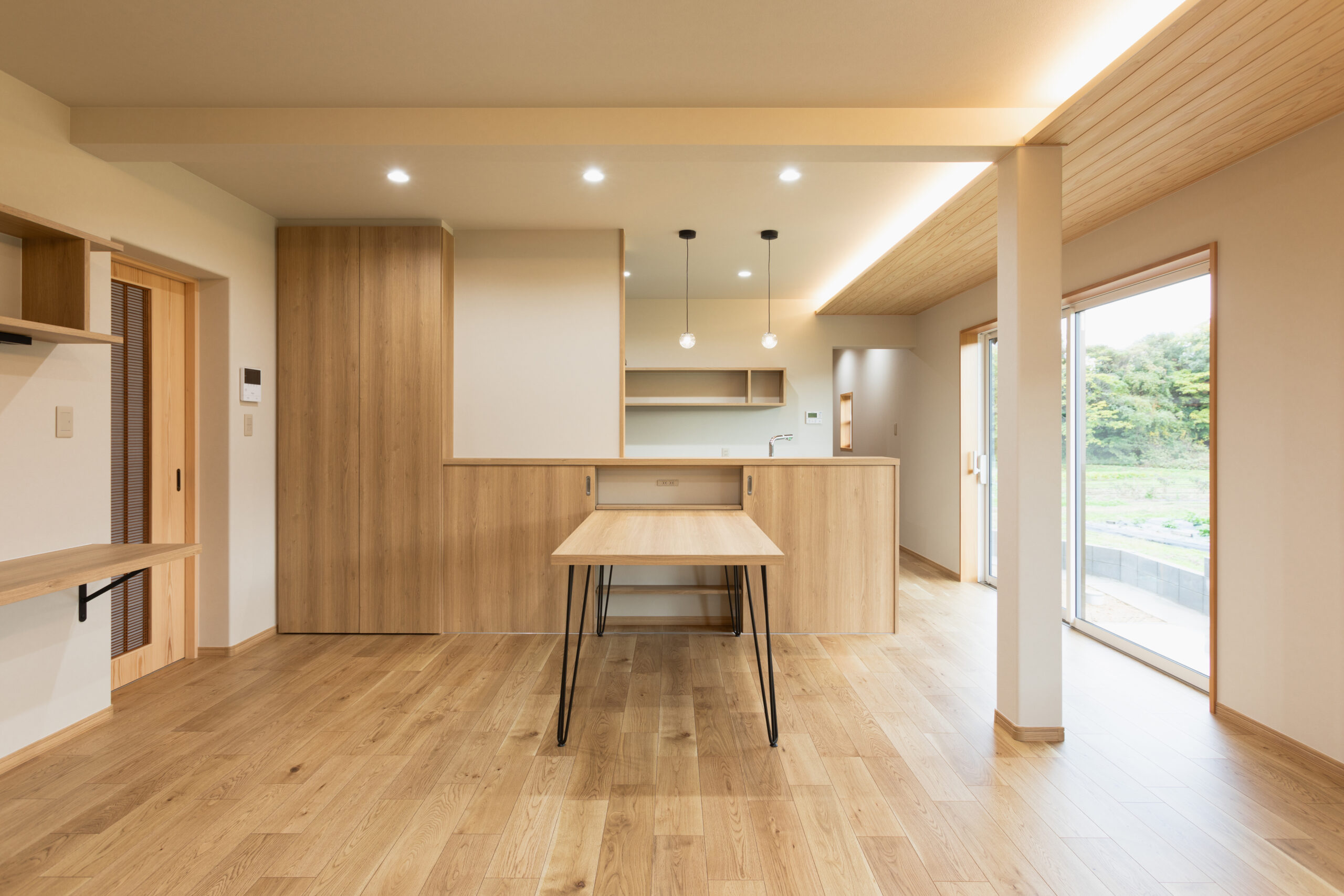 木目が柔らかく優しい雰囲気のLDK、キッチンの裏はパントリー、リビングにスタディーコーナー、新築に負けない暮らしやすさ