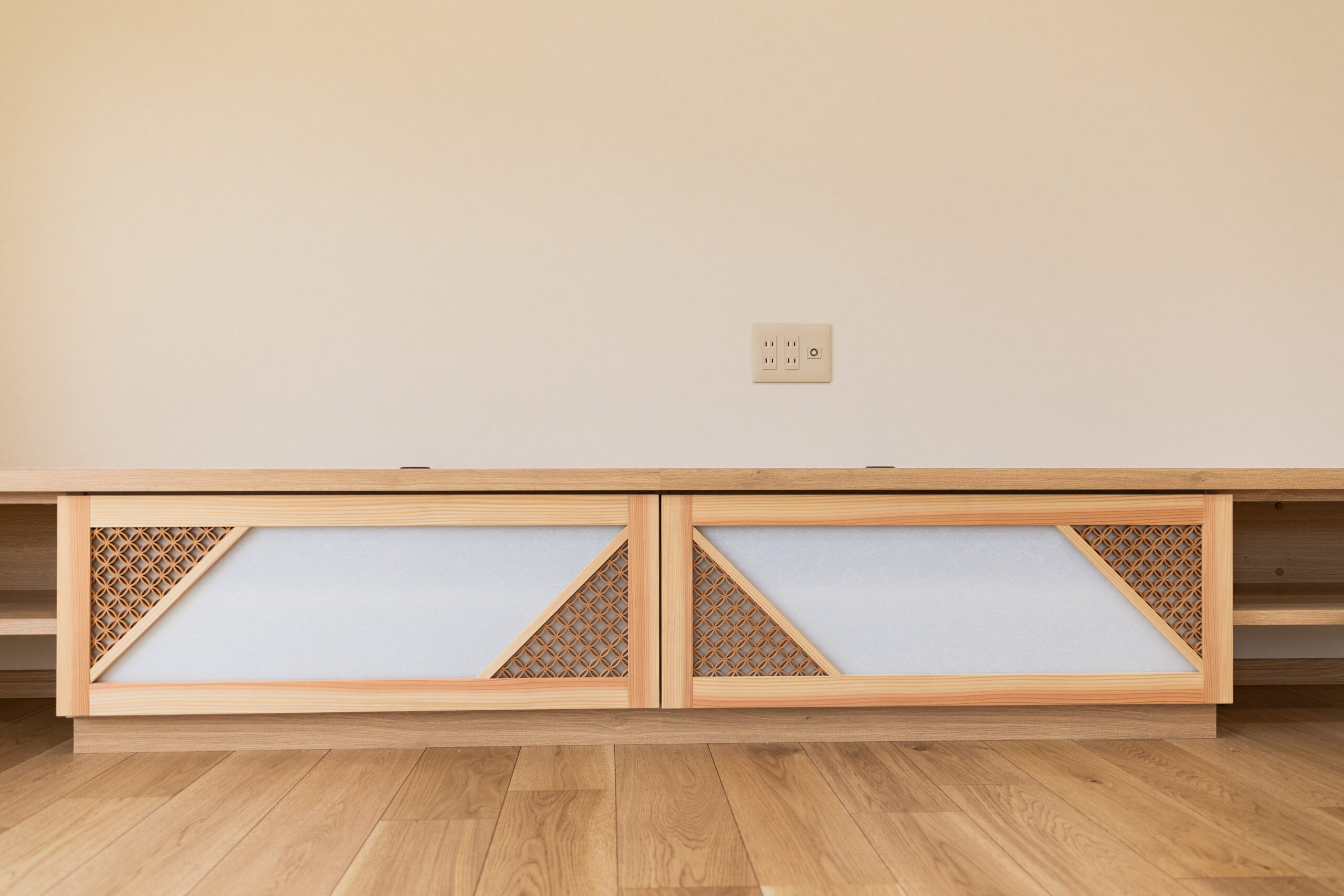 作り付けのテレビ台は、お爺様が作られた和室から再利用した組子をデザインのアクセントに